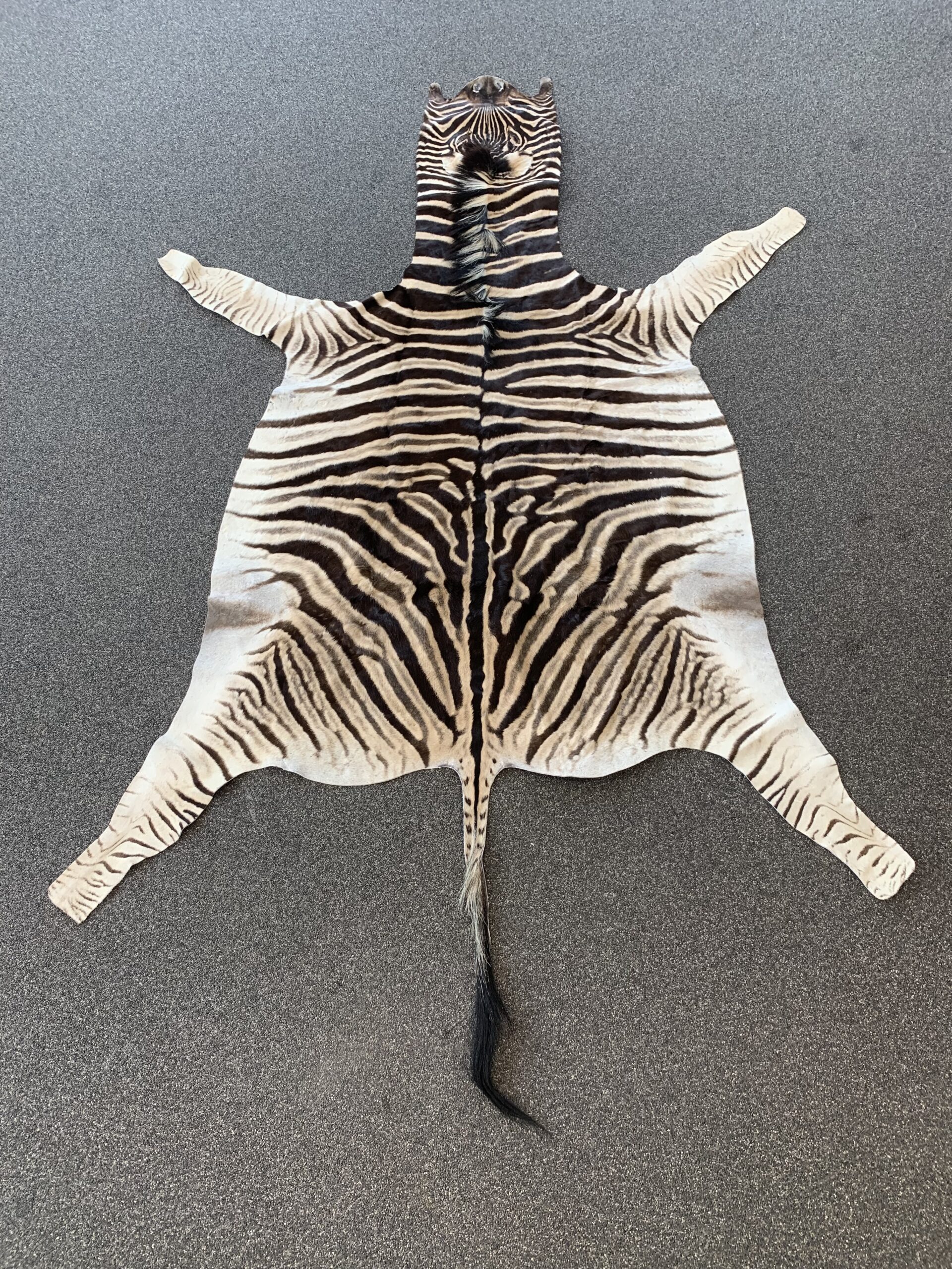Deze zebra huid heeft een lengte van 230 cm (310 met staart) en een breedte van 195 cm en een gewicht van 4kg