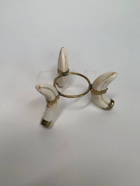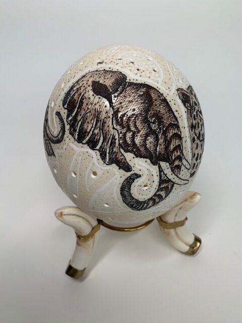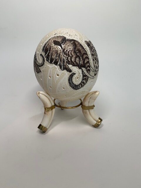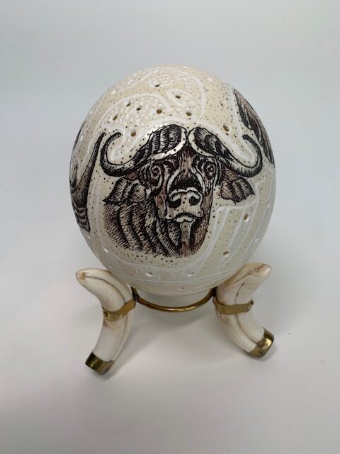 Dit echt Zuid Afrikaans struisvogelei is prachtig versierd met een natuurlijke big 5 bush setting en rust op een model van drie slachttanden afgewerkt met messing. Het is een opvallend mooi stuk voor je interieur.