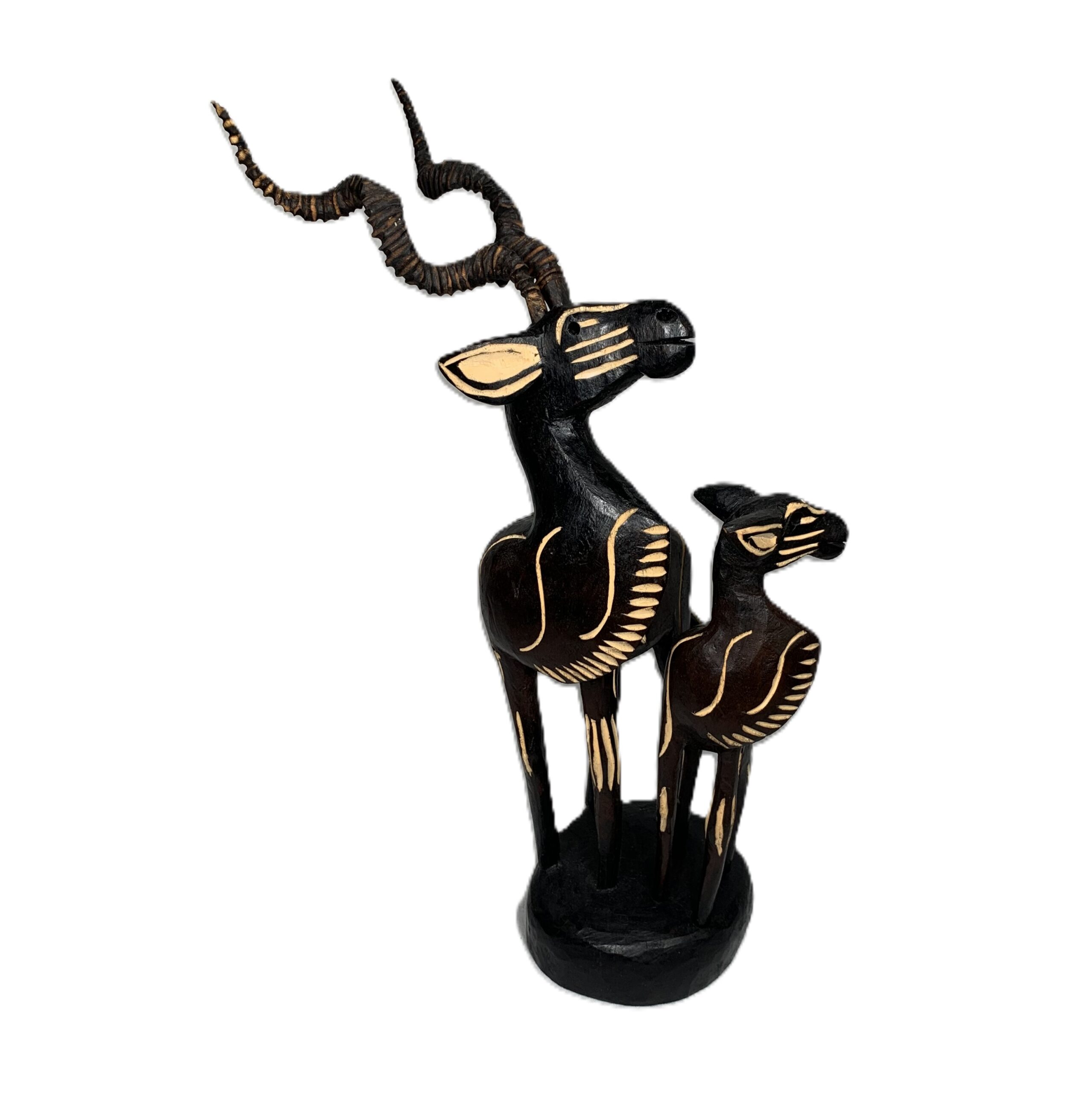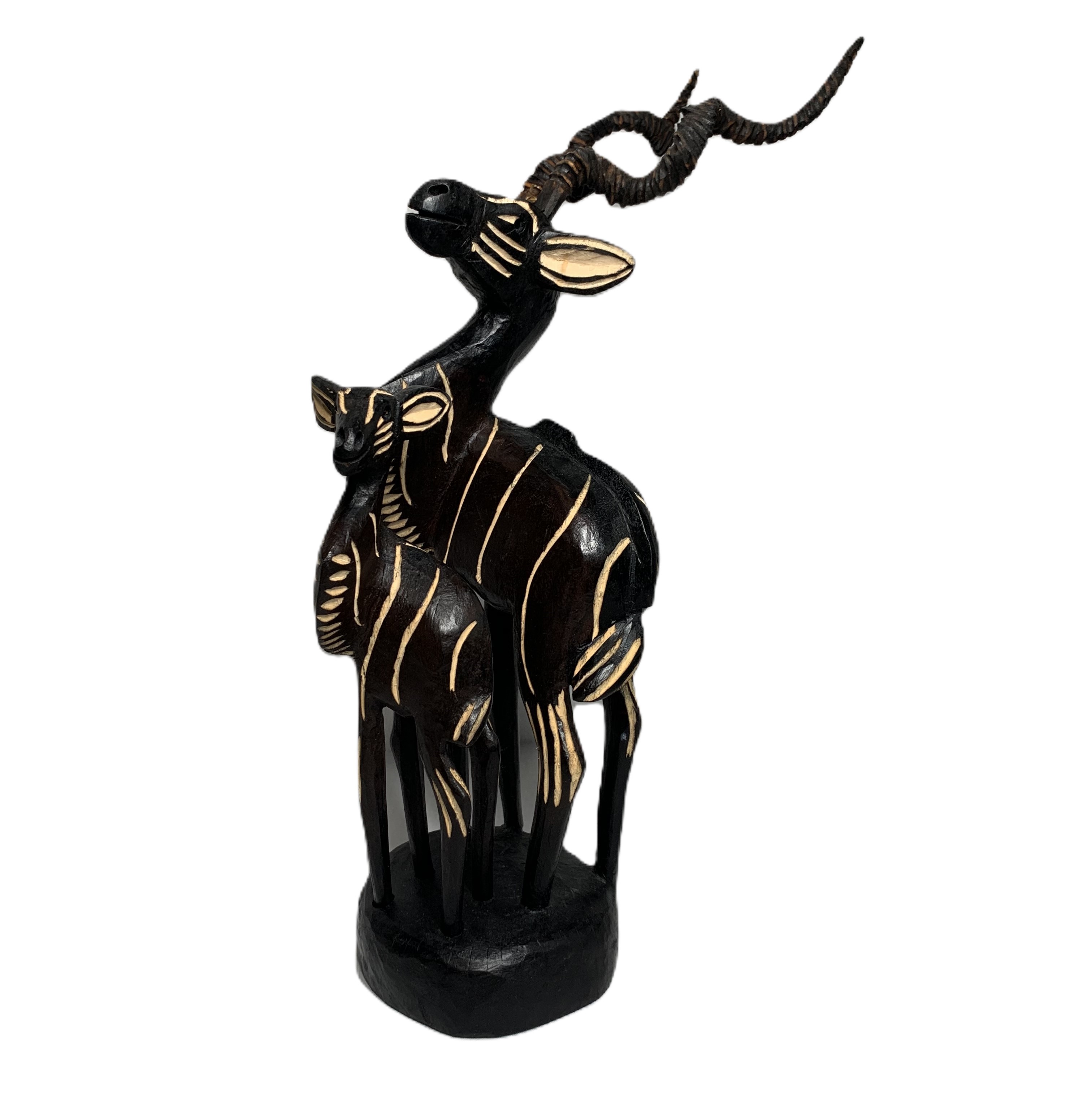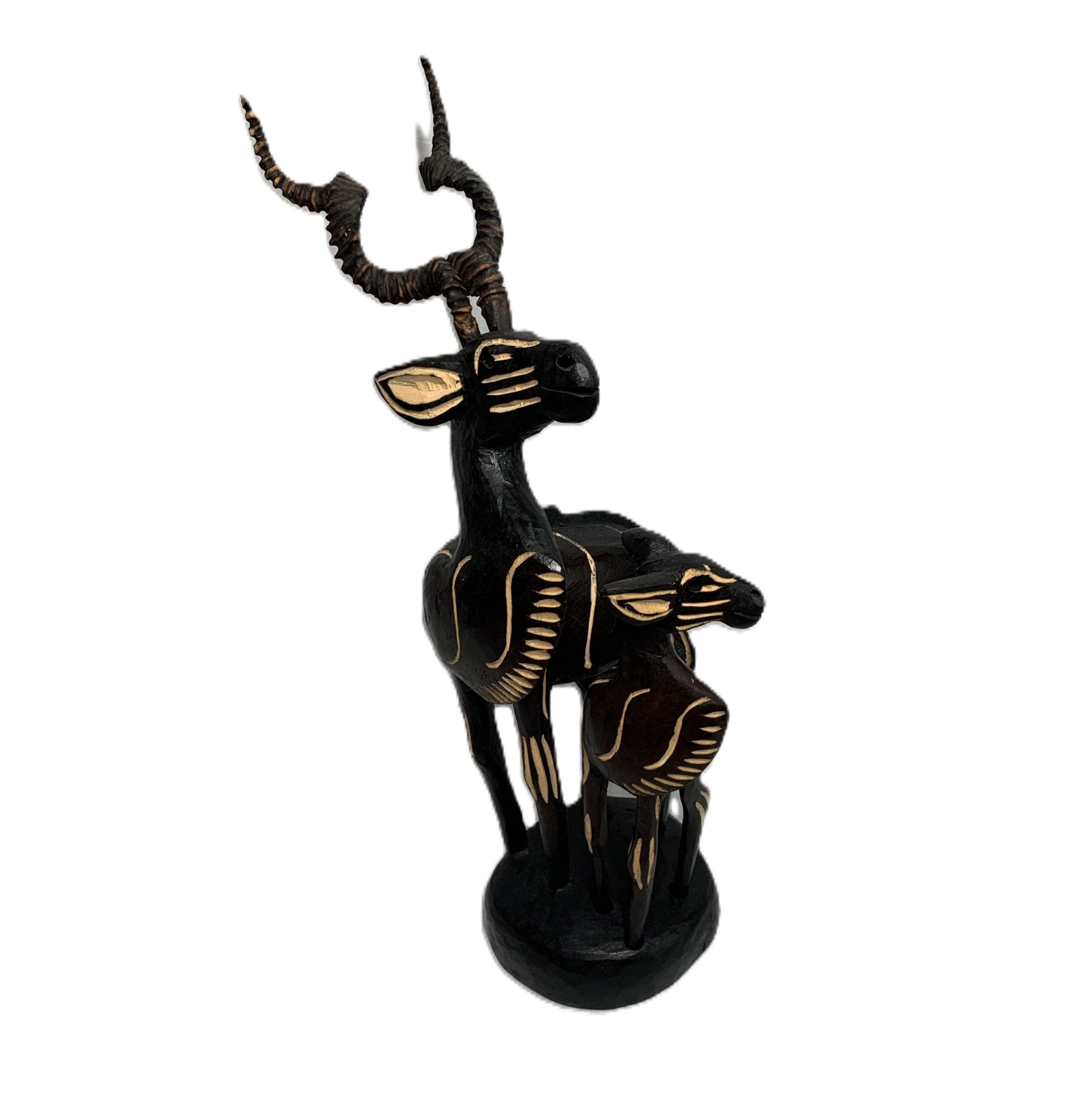 Dit met de hand gemaakte houten beeld van een grote mannelijke koedoe met jong is afkomstig uit Zuid Afrika. is c.a. 30 cm hoog en de horens en het jong zijn los uitneembaar.