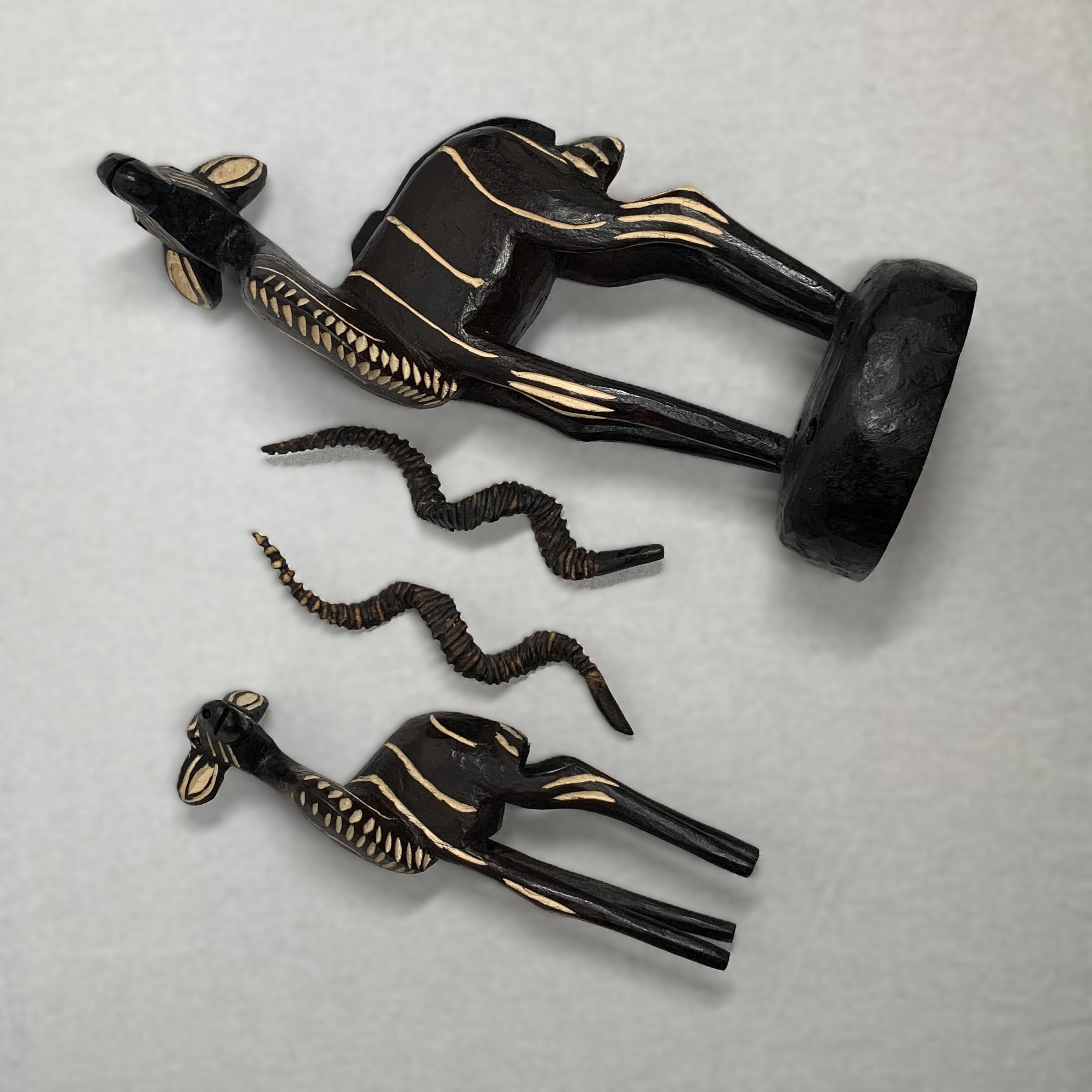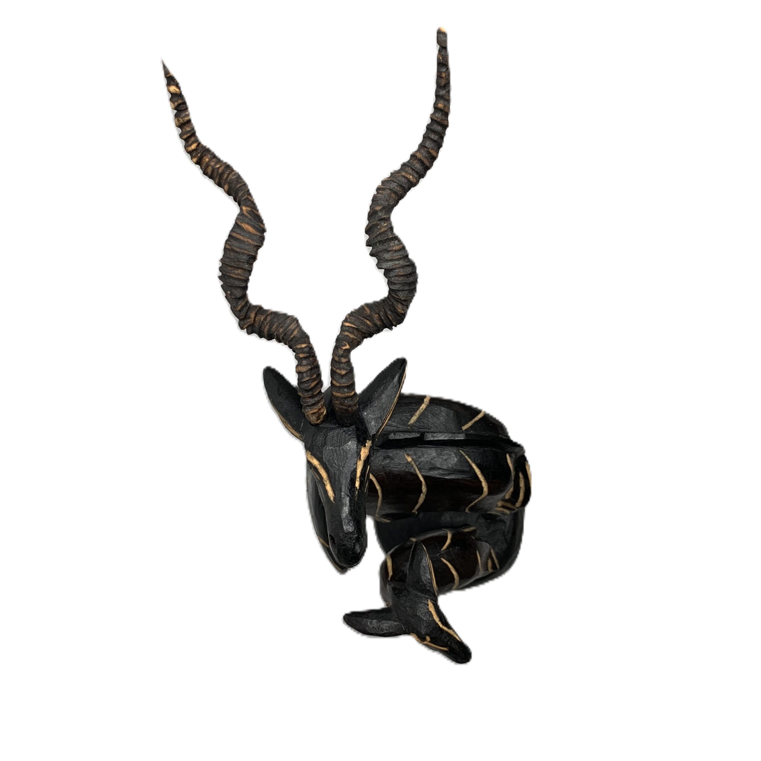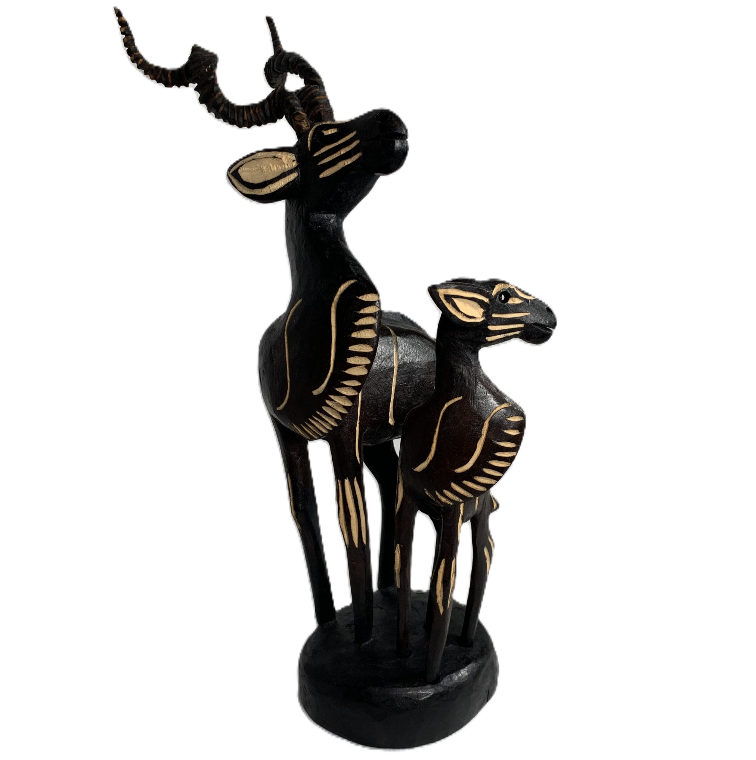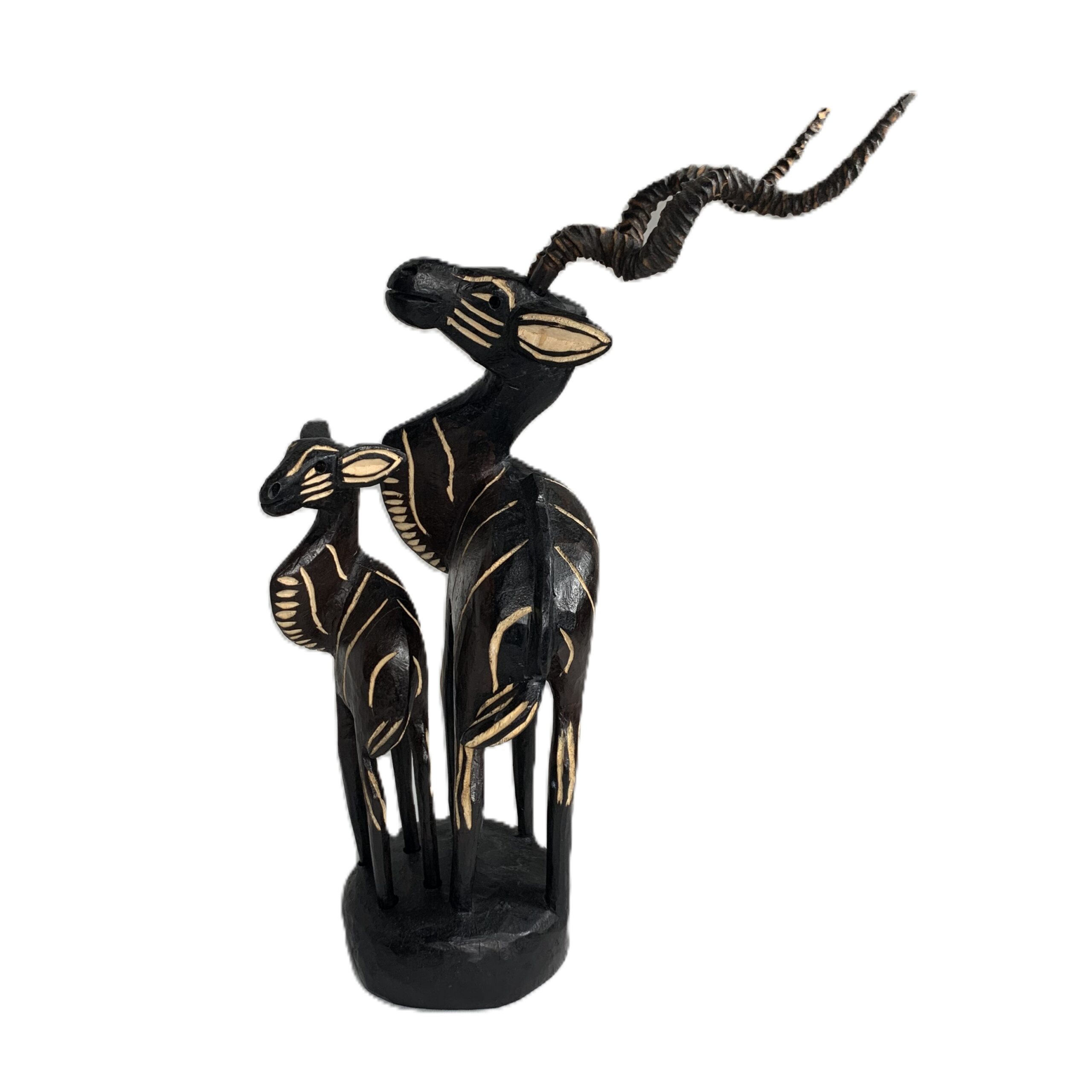 Dit met de hand gemaakte houten beeld van een grote mannelijke koedoe met jong is afkomstig uit Zuid Afrika. is c.a. 30 cm hoog en de horens en het jong zijn los uitneembaar.